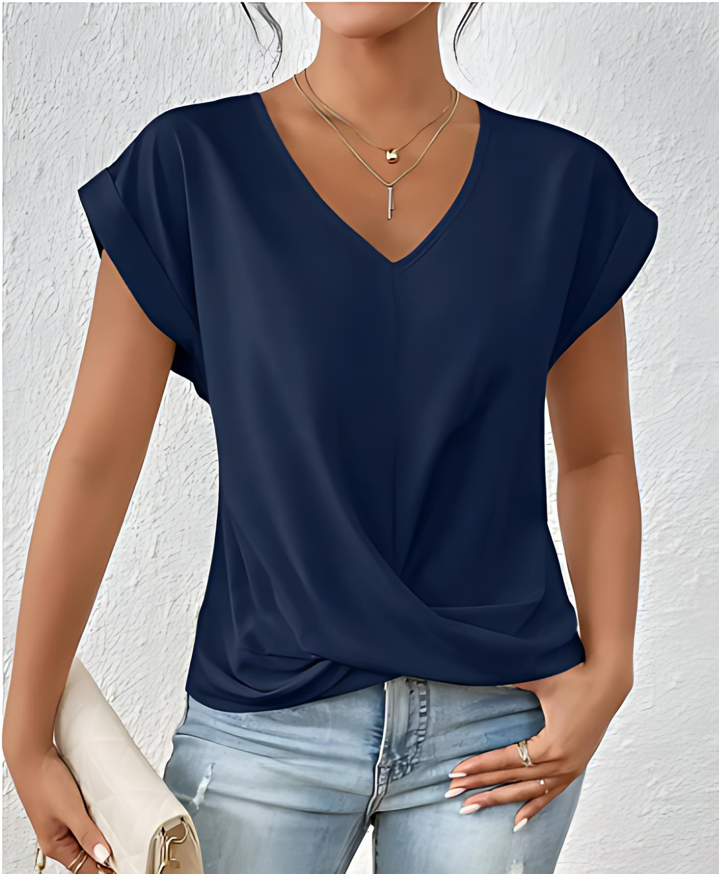 Das Virela T-Shirt kombiniert lässige Eleganz mit sommerlicher Frische. Das locker geschnittene Shirt aus weichem Polyester-Spandex-Mix bietet höchsten Tragekomfort und passt sich perfekt an jede Figur an. Mit seinem modischen Knoten-Design, den kurzen Ärmeln und der lockeren Passform ist es ideal für warme Tage. In mehreren Farben erhältlich, lässt sich der Look vielseitig kombinieren – von Jeans bis Rock. Perfekt für Alltag, Freizeit und Urlaub!